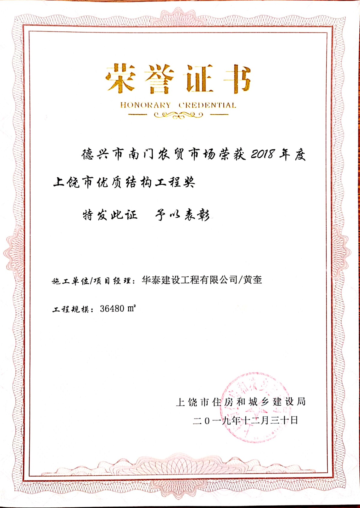 日前,由華泰建設(shè)工程有限公司承建的上饒德興南門農(nóng)貿(mào)市場(chǎng)項(xiàng)目,榮獲了上饒市住房和城鄉(xiāng)建設(shè)局頒發(fā)的“2018年度上饒市優(yōu)質(zhì)結(jié)構(gòu)工程獎(jiǎng)”。