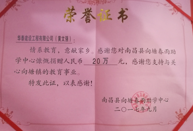 今天我們公司周總代表華泰建設(shè)及公司董事長(zhǎng)黃總參加向塘春雨助學(xué)活動(dòng)并捐獻(xiàn)愛心。公司在董事長(zhǎng)倡議及帶領(lǐng)下,大力弘揚(yáng)樂善好施的文明行為,積極營造人人關(guān)心、人人參與愛心助學(xué)行為的良好氛圍,先后參與春雨助學(xué)、苗苗助學(xué)等愛心活動(dòng)。