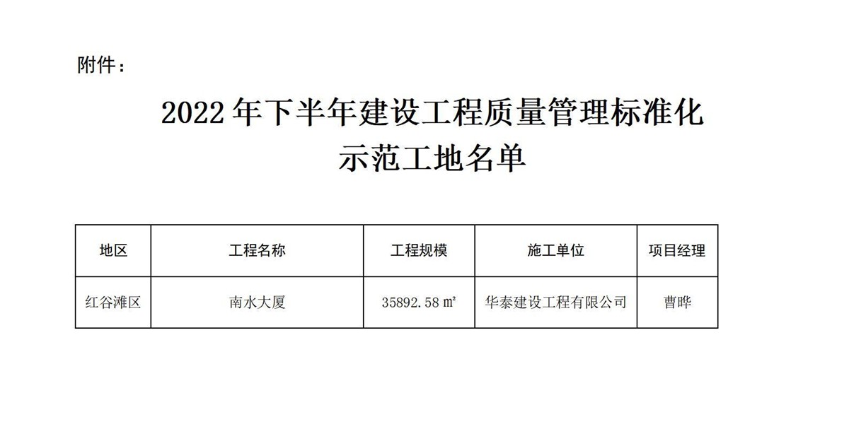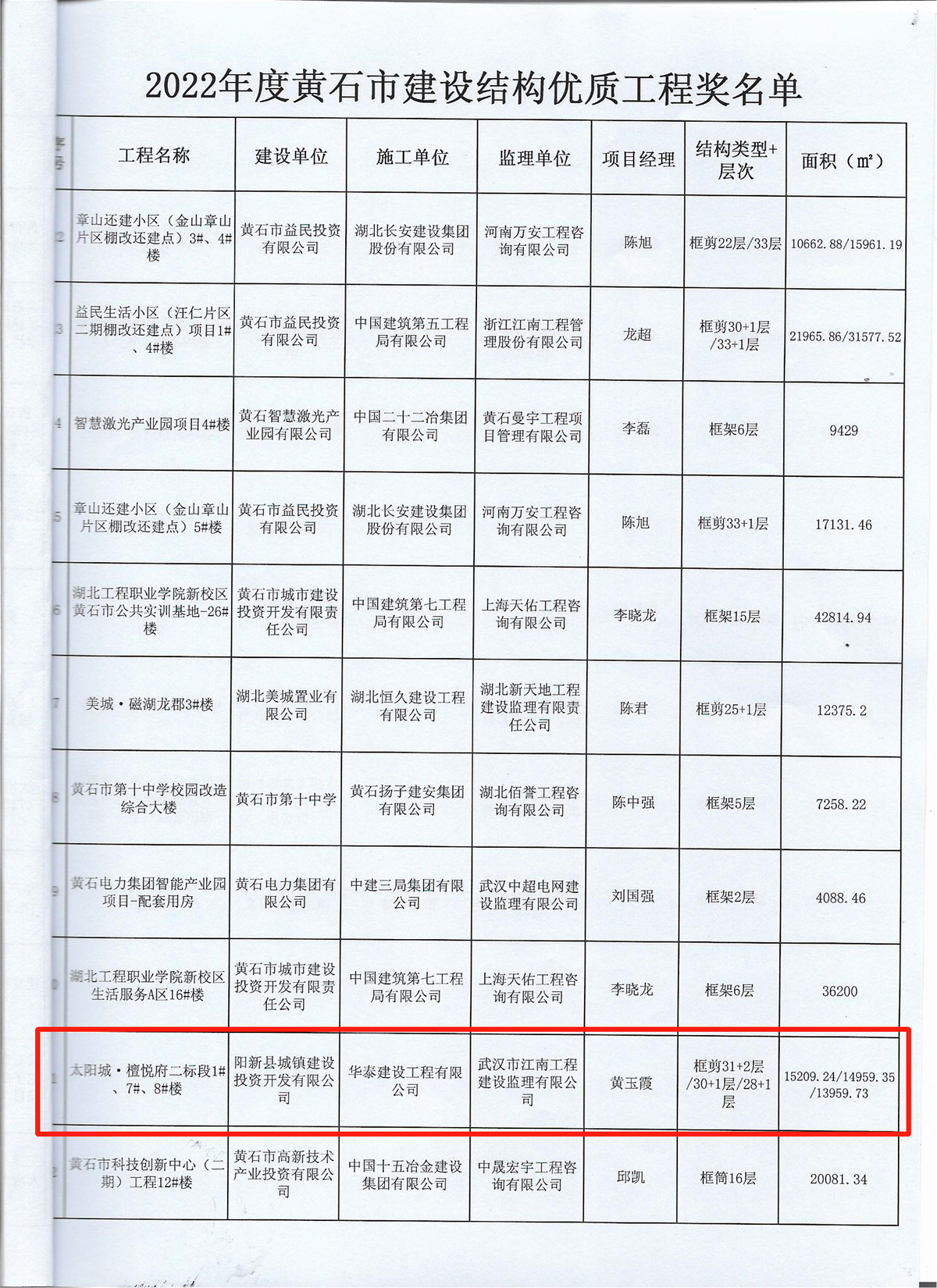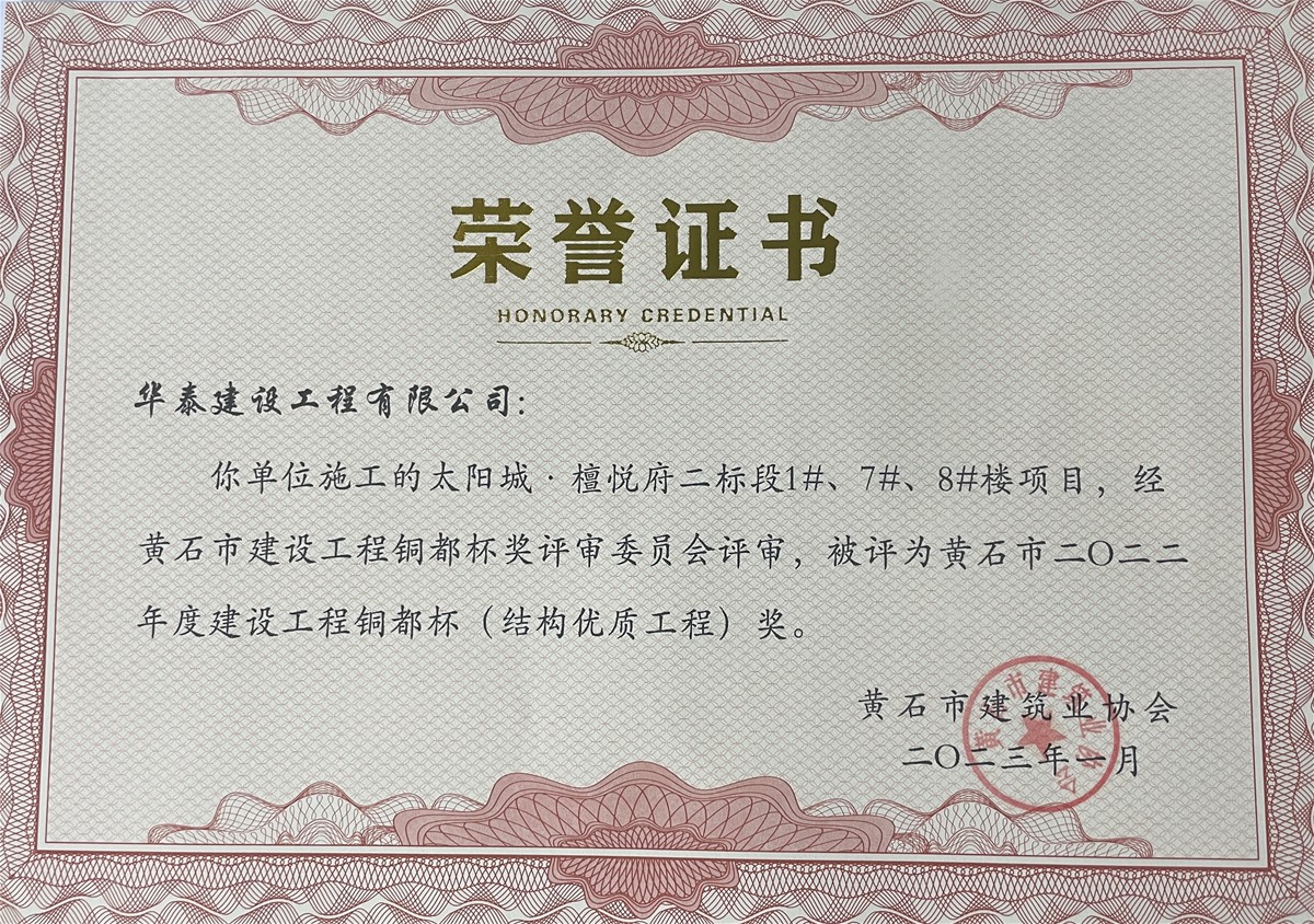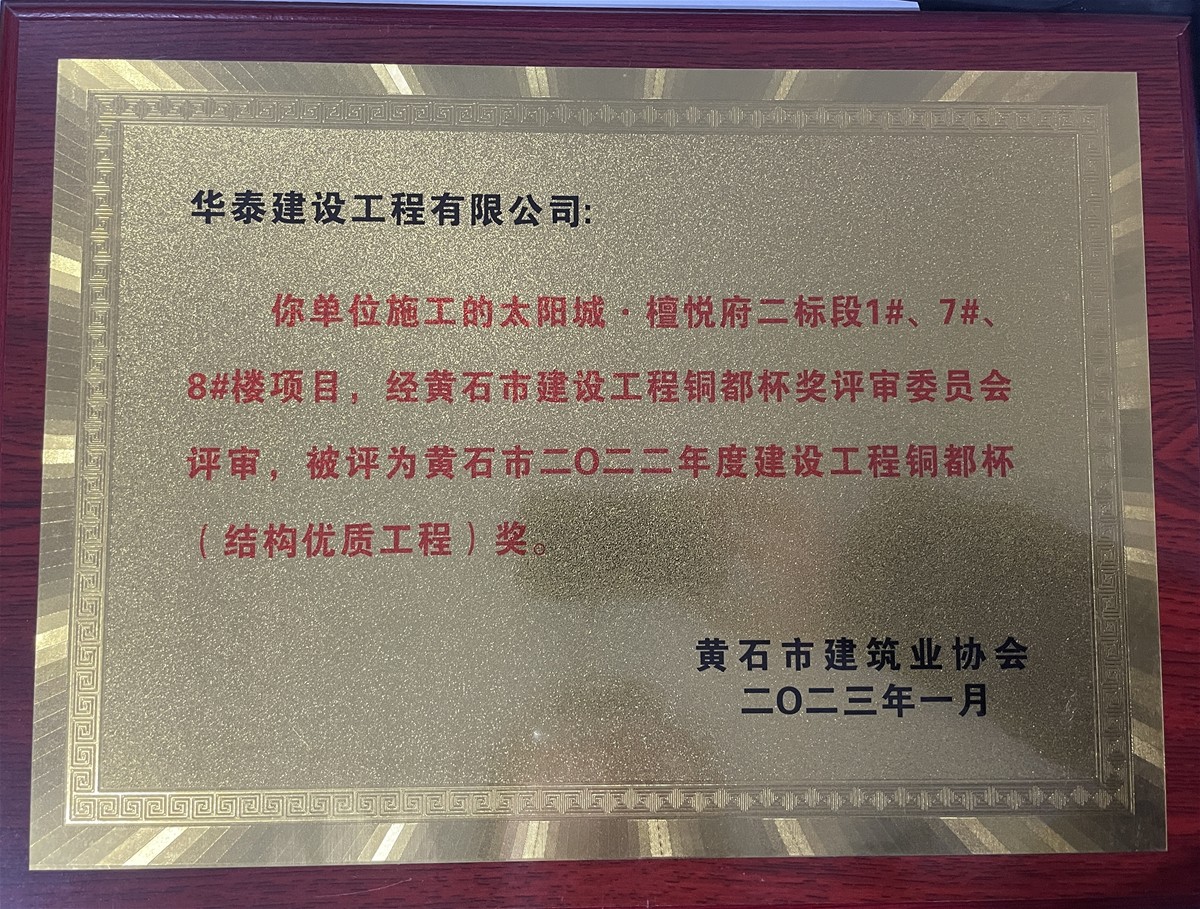 近日,在南昌市住房和城鄉(xiāng)建設(shè)局發(fā)布的《關(guān)于2022年下半年建設(shè)工程質(zhì)量管理標(biāo)準(zhǔn)化示范工地的通告》、黃石市建筑業(yè)協(xié)會發(fā)布的《關(guān)于授予2022年度黃石市建設(shè)結(jié)構(gòu)優(yōu)質(zhì)工程獎項目的通知》中,經(jīng)各屬地工程質(zhì)量監(jiān)督部門推薦和專家評價,由華泰建設(shè)工程有限公司承建的“南水大廈”項目與“太陽城·檀悅府二標(biāo)段1#、7#、8#樓”項目分別榮獲南昌市“2022年下半年建設(shè)工程質(zhì)量管理標(biāo)準(zhǔn)化示范工地”、“黃石市2022年度建設(shè)工程銅都杯(結(jié)構(gòu)優(yōu)質(zhì)工程)獎”。建設(shè)工程質(zhì)量標(biāo)準(zhǔn)化示范工地評比是考核參建單位質(zhì)量管理水平的重要標(biāo)準(zhǔn)之一,同時,建設(shè)工程銅都杯(結(jié)構(gòu)優(yōu)質(zhì)工程獎)代表了建筑工程結(jié)構(gòu)施工質(zhì)量的高水平,也是精品工程的重要標(biāo)志。獲此兩項殊榮,是對華泰建設(shè)項目施工水平及安全質(zhì)量管理的充分肯定,彰顯了華泰建設(shè)在工程項目管理、工程品質(zhì)等領(lǐng)域的卓越實力。